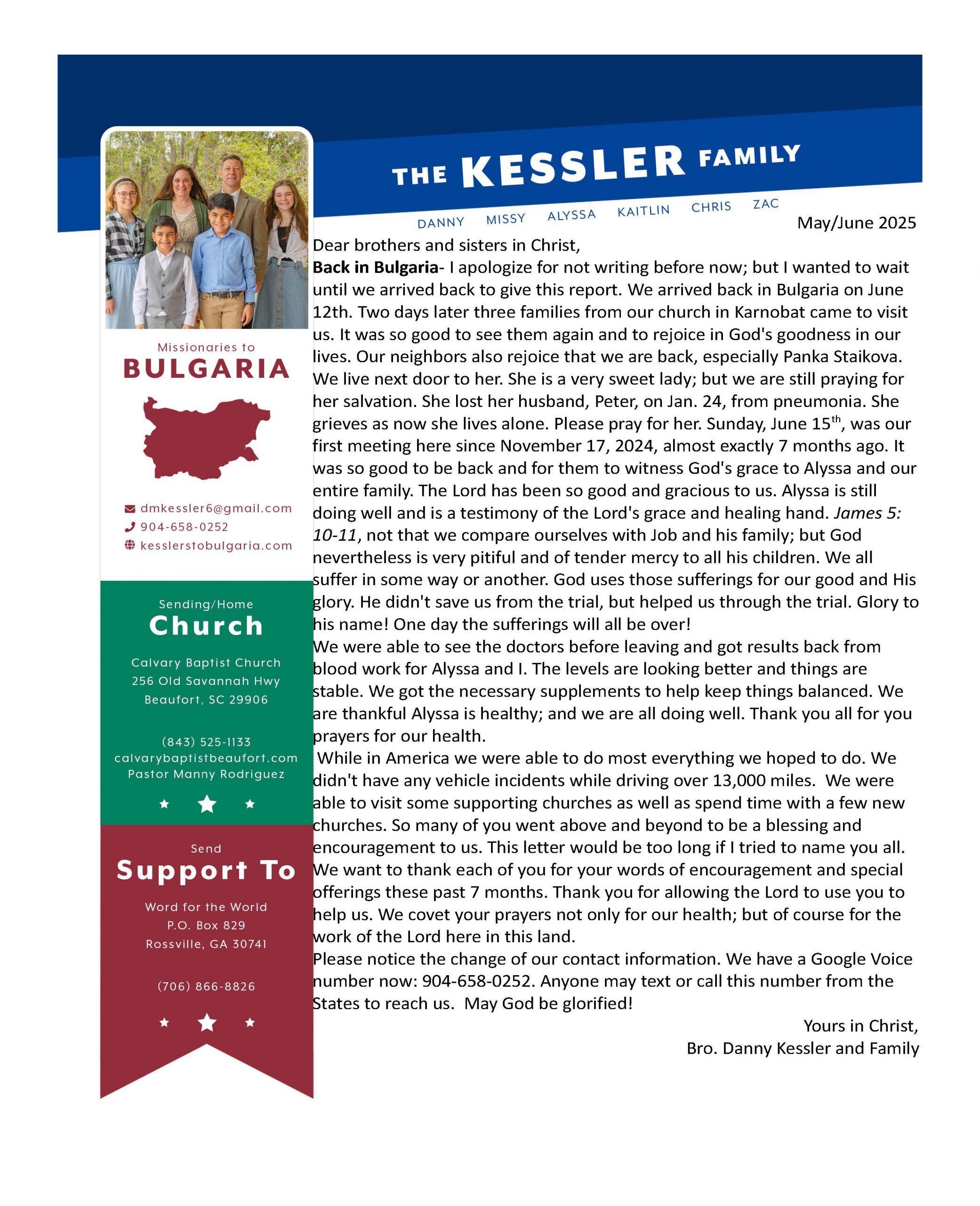 Back in Bulgaria- I apologize for not writing before now; but I wanted to wait until we arrived back to give this report. We arrived back in Bulgaria on June 12th. Two days later three families from our church in Karnobat came to visit us. It was so good to see them again and to rejoice in God’s goodness in our lives. Our neighbors also rejoice that we are back, especially Panka Staikova. We live next door to her. She is a very sweet lady; but we are still praying for her salvation. She lost her husband, Peter, on Jan. 24, from pneumonia. She grieves as now she lives alone. Please pray for her. Sunday, June 15th, was our first meeting here since November 17, 2024, almost exactly 7 months ago. It was so good to be back and for them to witness God’s grace to Alyssa and our entire family. The Lord has been so good and gracious to us. Alyssa is still doing well and is a testimony of the Lord’s grace and healing hand. James 5:10-11, not that we compare ourselves with Job and his family; but God nevertheless is very pitiful and of tender mercy to all his children. We all suffer in some way or another. God uses those sufferings for our good and His glory. He didn’t save us from the trial, but helped us through the trial. Glory to his name! One day the sufferings will all be over!